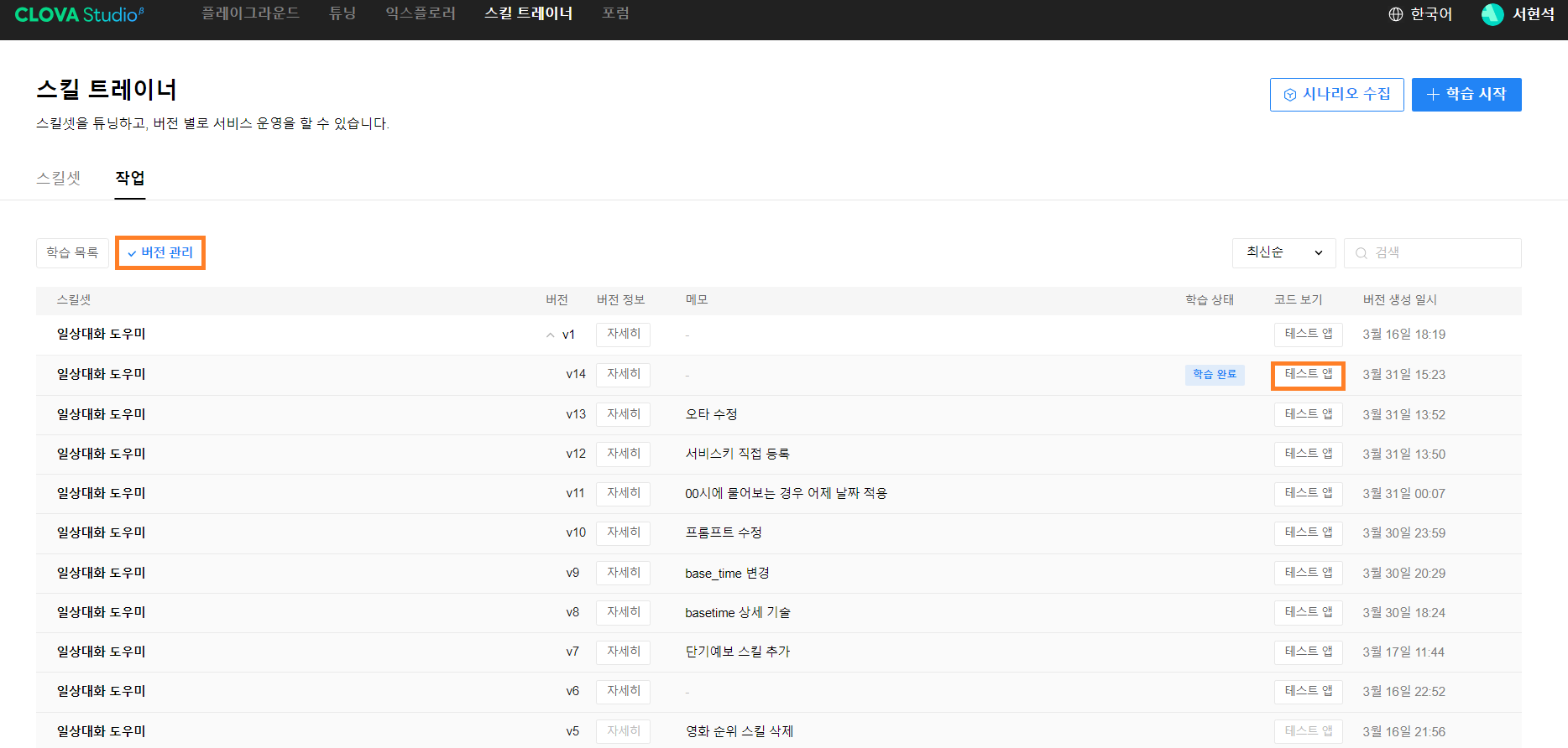 CLOVA Studio 스킬 학습 완료 [버전 관리] 버튼을 클릭하시면 학습이 완료된 스킬셋 버전을 확인하실 수 있습니다. 지금까지 작업한 시나리오가 반영된 모델이므로 [테스트 앱] 버튼을 통해 API를 만들어서 나만의 서비스에 적용해 보시면 원하시는 답변을 얻을 수 있게 될 겁니다.