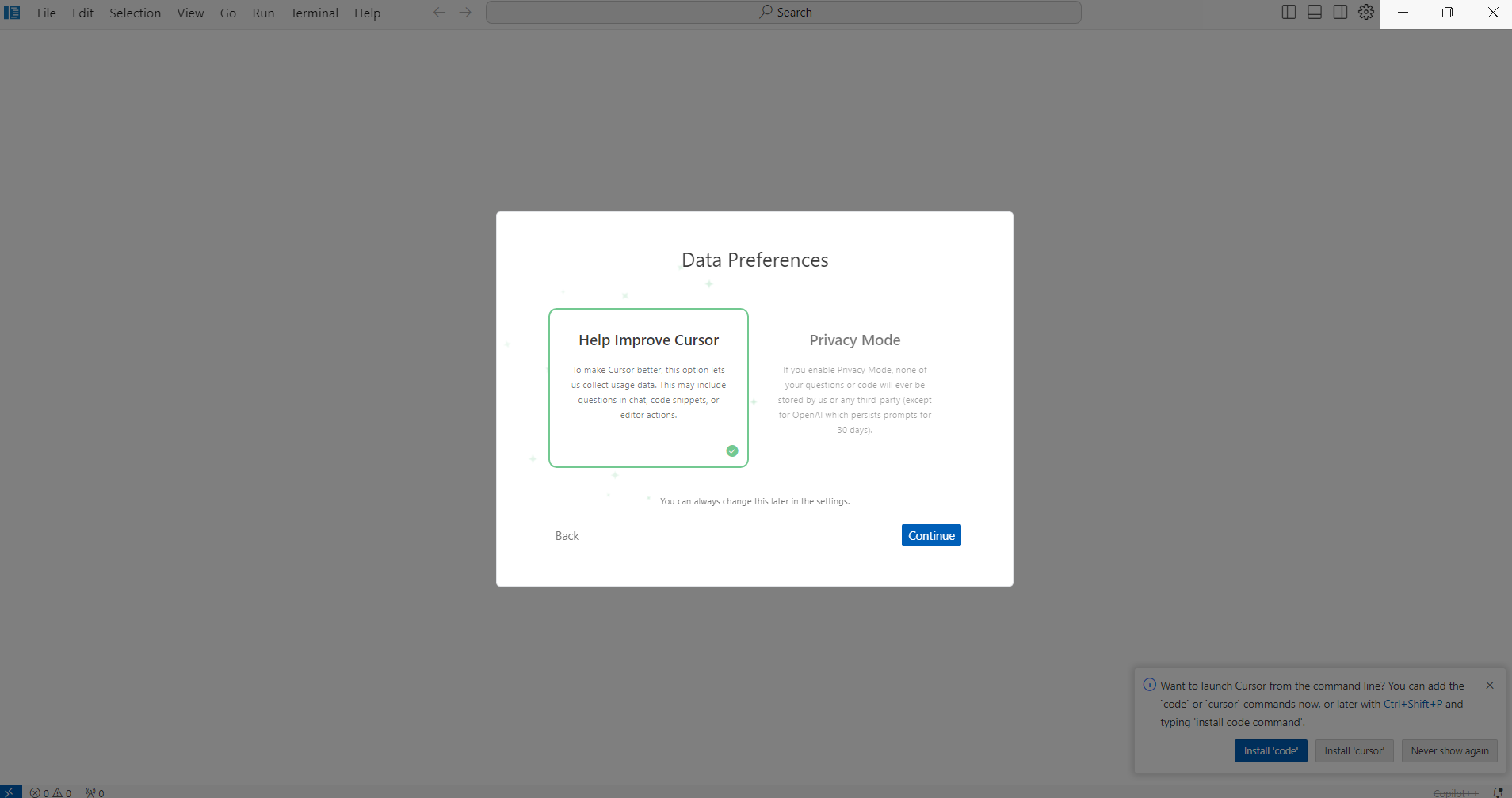 프라이버시 모드 사용여부 체크 마지막으로는 Cursor 회원가입을 하시면 되는데요. 이 부분을 skip 하시면 AI사용이 불가능하므로 반드시 회원가입을 하셔야 합니다. 메일, 구글, 깃헙 중에 선택할 수 있는데 저는 깃헙 계정과 연동하였습니다.
