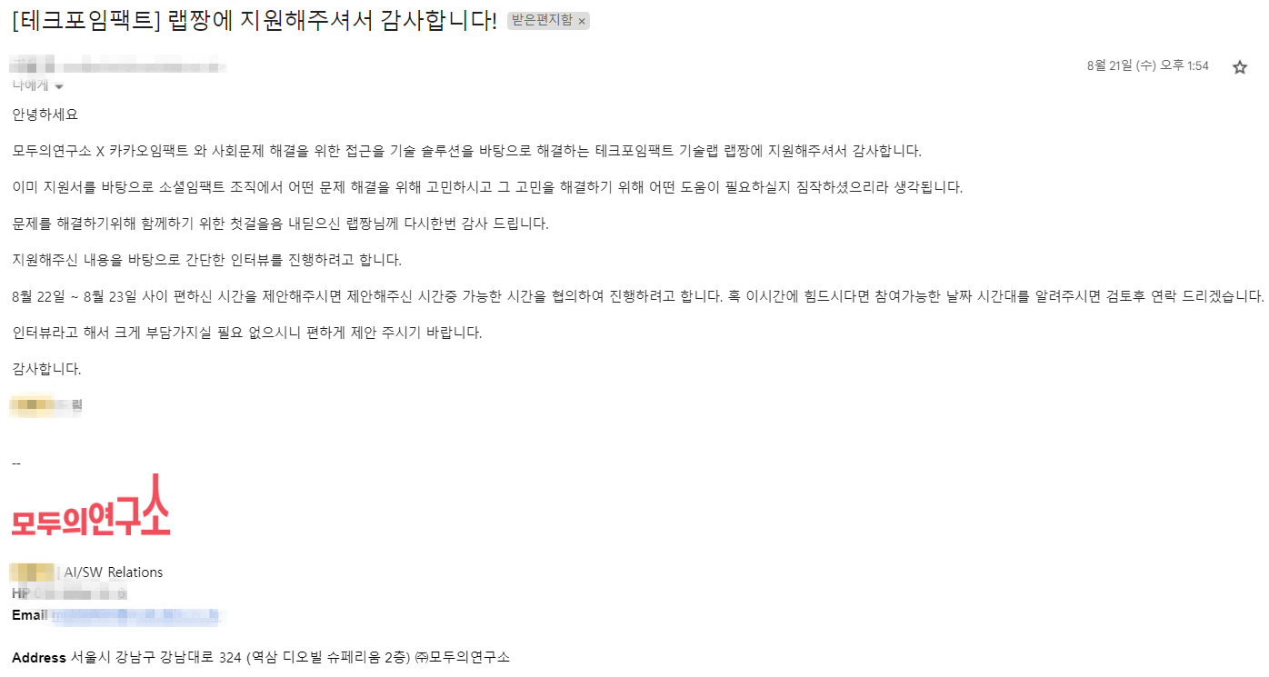 모두의연구소에서는 부스트코스, 풀잎스쿨 퍼실이로 각각 수료함으로써 성실함과 책임감을 입증하였습니다. 챗봇, LLM, 서버리스, 카카오 오픈빌더 모두 경험해 보았기 때문에 해당 프로젝트를 성공적으로 완수하는데 도움이 될 수 있을 것 같습니다.위와 같이 지원서를 접수하고 기다린 결과 다음과 같이 인터뷰 요청 메일을 받을 수 있었는데요. 인터뷰는 작성한 지원서를 바탕으로 진행되었고 기술력을 많이 물어보기보다는 5개월이라는 긴 기간 동안 프로젝트를 잘 이끌 수 있을지 리더십 위주로 진행되었습니다.