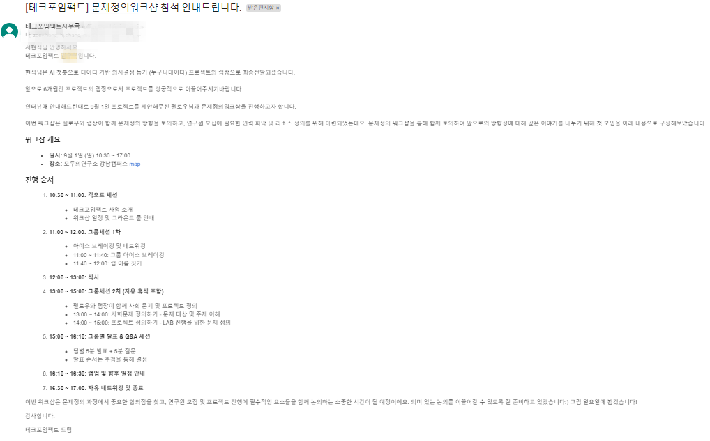 랩짱 최종 선발 결과 및 문제정의 워크샵 일정 안내 랩짱으로 선발되고 나서 가장 먼저 하는 일은 모두의연구소에서 열리는 문제정의 워크샵에 참여하여 브라이언 펠로우와 직접 만나 프로젝트의 방향성에 대해 이야기 나누고 정의하는 시간을 갖게 됩니다.