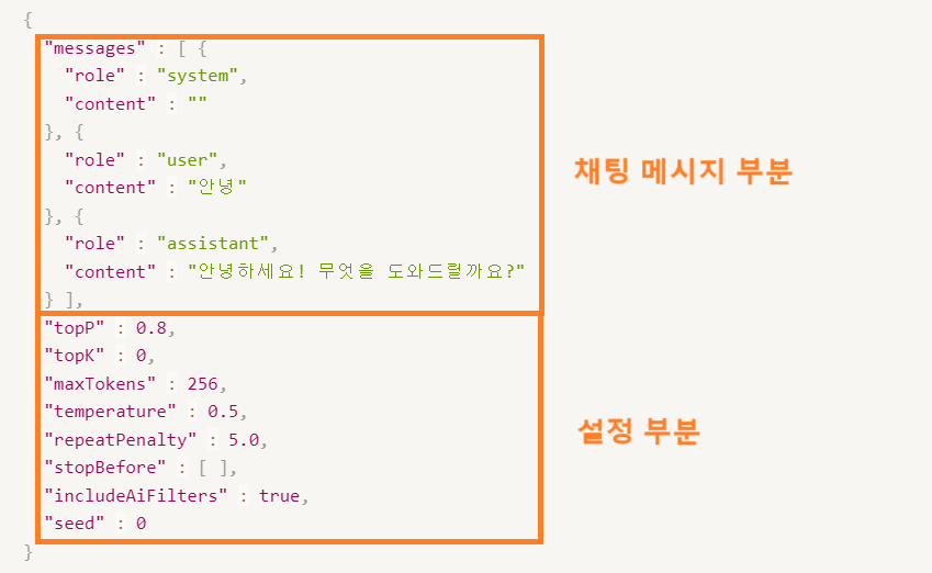 CLOVA Studio Completion API Spec CLOVA Studio에서 발급받은 API를 사용할 경우 다음과 같이 전송을 할 수 있는데요. 여기서 messages 옵션이 앞서 UI에서 보았던 채팅창의 메시지 부분에 해당합니다. API 호출시 필요한 옵션들이므로 모두 ContextProvider에서 상태로 관리할 수 있도록 구현 해보겠습니다.