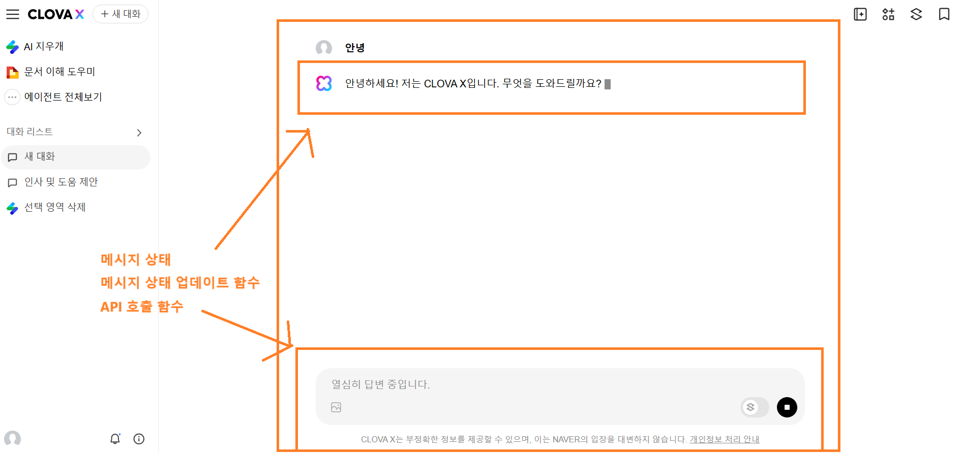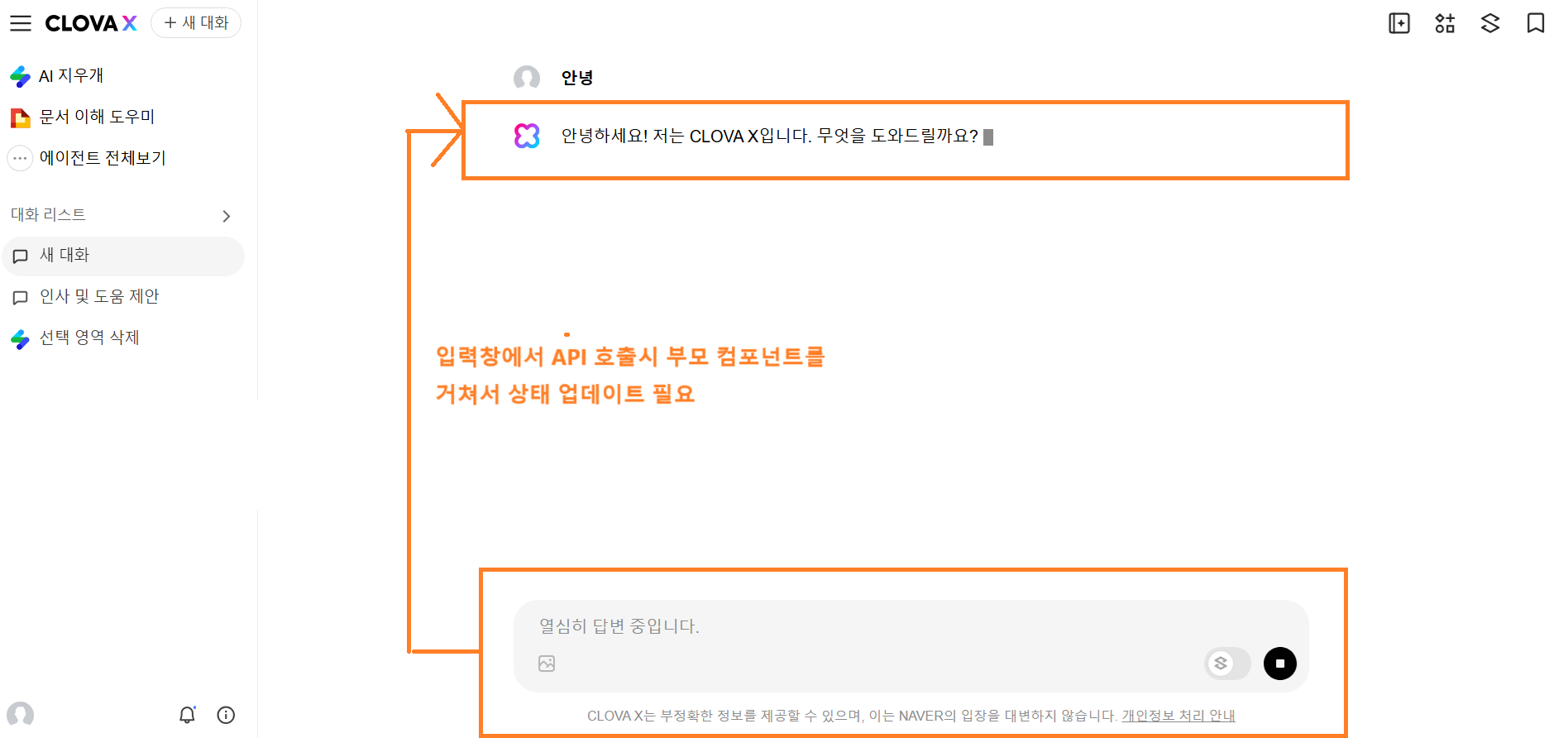 CLOVA X 호출 API는 어디서 관리 통상적으로는 사용자가 입력창에서 메시지를 입력하니까 API도 해당 부분에 같이 있어야 할 것 같지만 실제로는 전체 영역에 해당하는 부분에서 정의가 되어야 합니다.