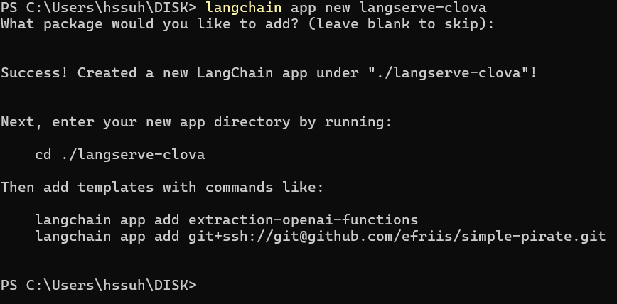 먼저 다음과 같이 langchain-cli를 PC 내에 전역적으로 사용할 수 있도록 설치해놓습니다.