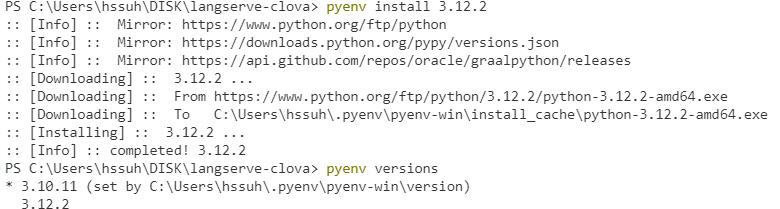 langchain-cli로 초기셋팅시 설치된 의존성들 보시면 파이썬 3.11 버전 이상을 사용해야 한다고 나와있습니다. 저는 그 보다 더 낮은 버전을 사용하고 있으므로 높은 버전의 파이썬을 하나 더 설치하도록 하겠습니다. 파이썬의 경우 여러 버전들을 관리해야 되는 경우 pyenv를 사용해 주시는 것이 좋습니다.