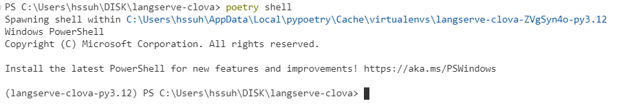 설치한 파이썬 버전으로 poetry 설정 그 이후에는 poetry shell 명령어를 입력하시면 python v3.12 환경으로 가상환경에 접속된 것을 확인하실 수 있습니다.