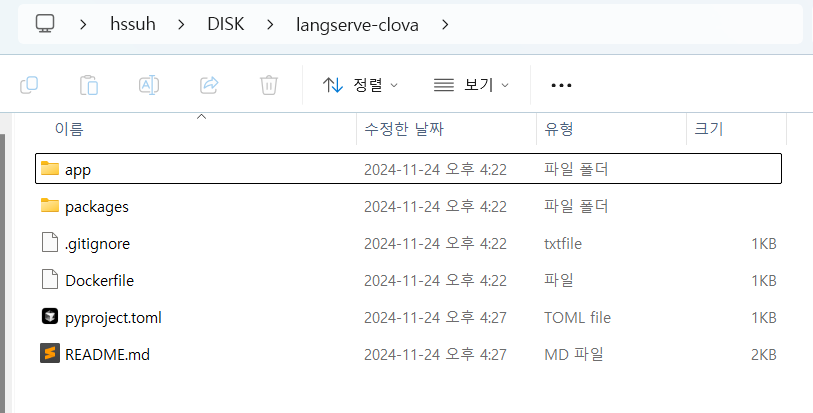 langchain app new langserve-clova위 명령어를 실행하고 나면 다음과 같이 프로젝트가 생성된 것을 볼 수 있습니다. Dockerfile부터 pyprojct.toml 파일까지 개발과 배포에 필요한 요소들을 자동으로 생성한 것을 확인할 수 있습니다. 그러면 이제 이 프로젝트를 사용하고 계신 에디터를 이용해서 오픈하여 사용하시면 됩니다.