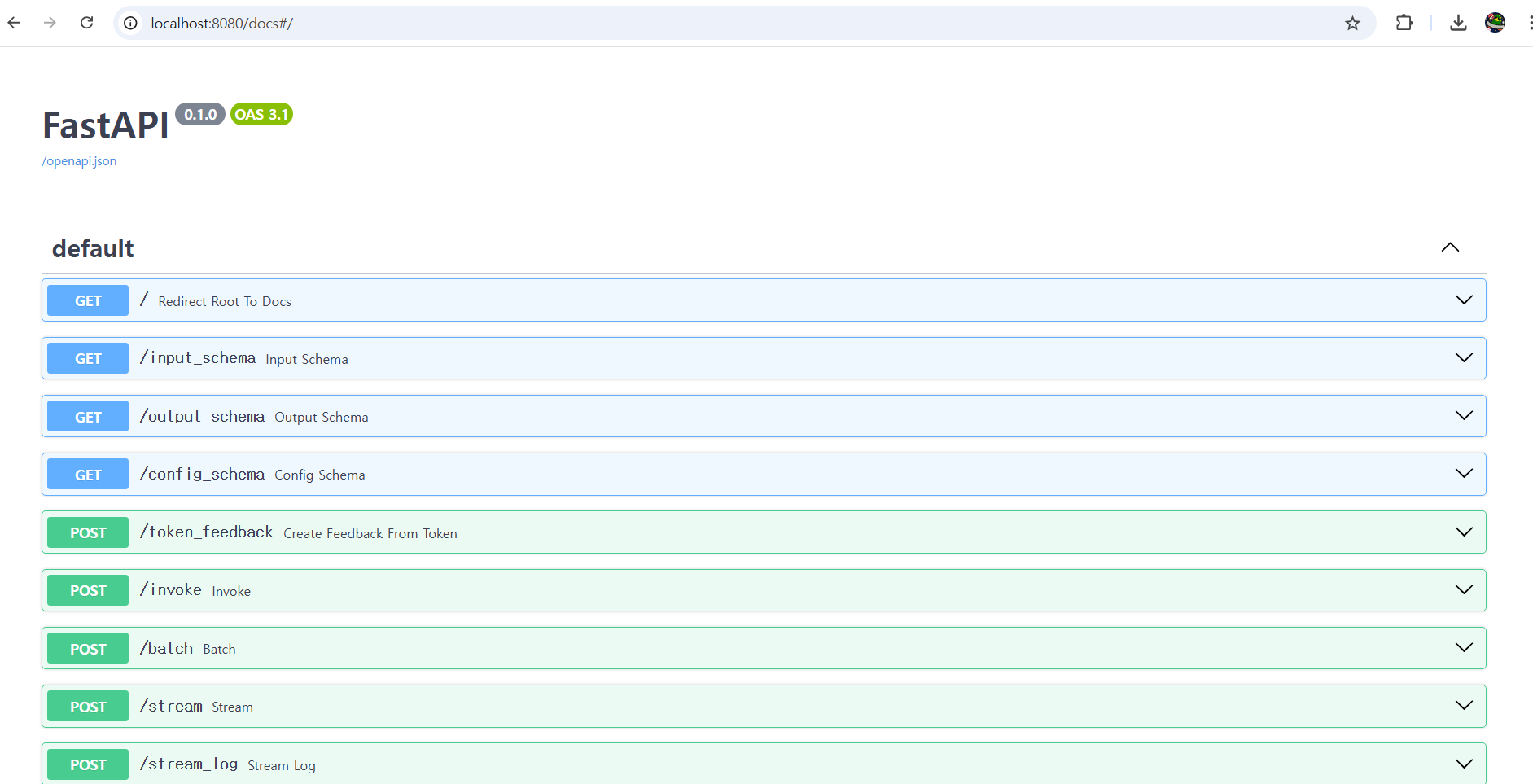 uvicorn app.server:app --host 0.0.0.0 --port 8080다음과 같이 유비콘을 실행하고 나면 랭서브가 구동되는 것을 확인하실 수 있게 됩니다.