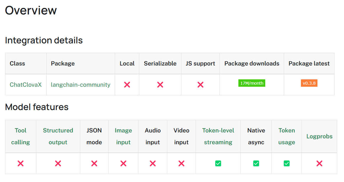 (좌) ChatClovaX (우) ChatOpenAi 언뜻 보았을 때 아직은 많은 기능들을 지원하고 있지는 않습니다. Tool Calling이나 구조적인 아웃풋 생성, JSON 모드, 이미지 입력등은 사용할 수 없는 것으로 보여지고 있습니다.