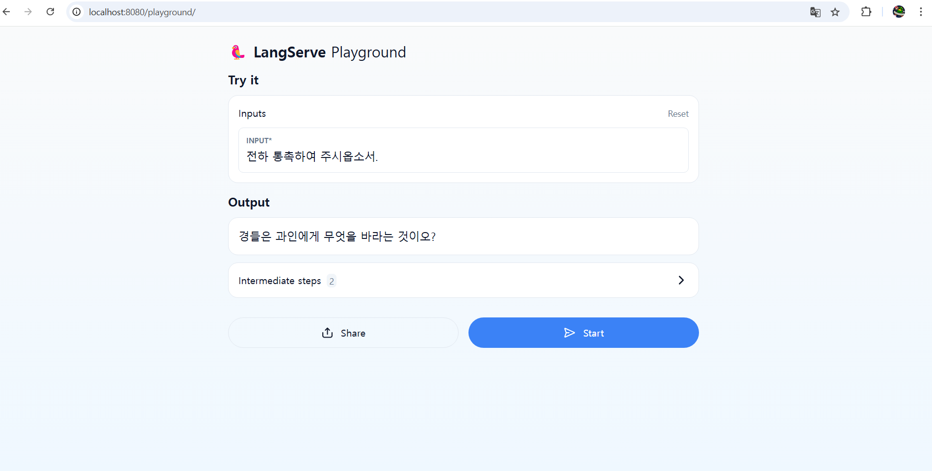 랭서브 구동 성공 랭서브로 구동하면 다음과 같이 플레이그라운드를 지원하는데요. 만들어 놓은 라우터 뒤에 /playground만 입력하시면 다음과 같이 멋진 테스트 환경이 나타납니다. langserve를 사용하면 이제 더 이상 힘들게 streamlit이나 gradio 같은 UI도구를 구현하지 않아도 된다는 장점이 있습니다.