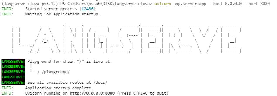 uvicorn app.server:app --host 0.0.0.0 --port 8080다음과 같이 유비콘을 실행하고 나면 랭서브가 구동되는 것을 확인하실 수 있게 됩니다.