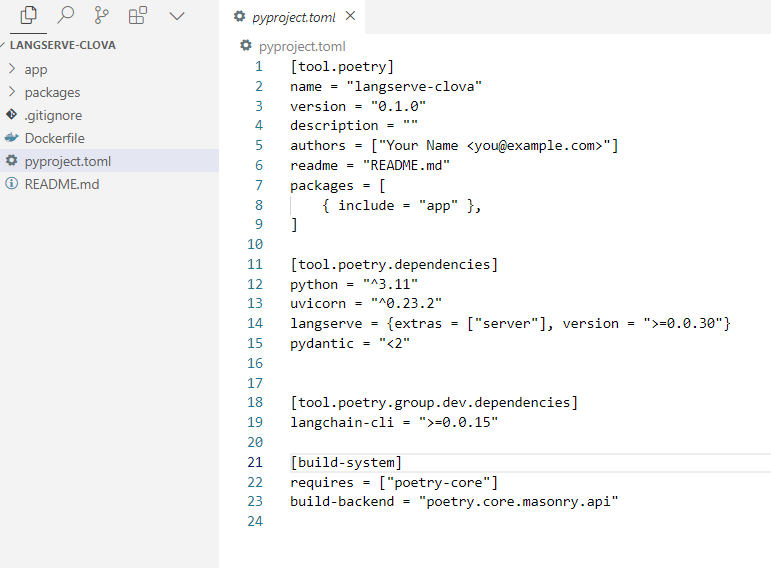 langchain app new langserve-clova위 명령어를 실행하고 나면 다음과 같이 프로젝트가 생성된 것을 볼 수 있습니다. Dockerfile부터 pyprojct.toml 파일까지 개발과 배포에 필요한 요소들을 자동으로 생성한 것을 확인할 수 있습니다. 그러면 이제 이 프로젝트를 사용하고 계신 에디터를 이용해서 오픈하여 사용하시면 됩니다.