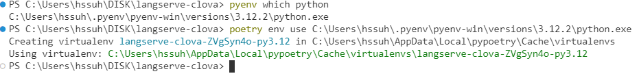 pyenv를 통해 python 설치과정 파이썬까지 세팅이 되었다면 이번에는 poetry를 사용해서 가상환경에 접속하도록 하겠습니다. 요즘 파이썬의 가상환경과 패키지 의존성관리 도구는 poetry가 많이 뜨고 있는 것 같습니다. Langserve 공식홈페이지 설치 가이드에서도 poetry 사용으로 가이드가 나와있는 것을 확인하실 수 있습니다.