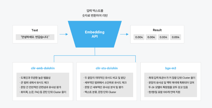 도구명 모델명 최대 토큰 수 벡터 차 권장 거리 지표 distance metric) 비고 임베딩 clir-emb-dolphin 500 토큰 1024 IP (Inner/Dot/Scalar Product; 내적) 임베딩 clir-sts-dolphin 500 토큰 1024 Cosine Similarity (코사인 유사도) 임베딩v2 bge-m3 8,192 토큰 1024 Cosine Similarity (코사인 유사도) 오픈 소스 모델* 각 모델들의 특징은 다음과 같습니다.