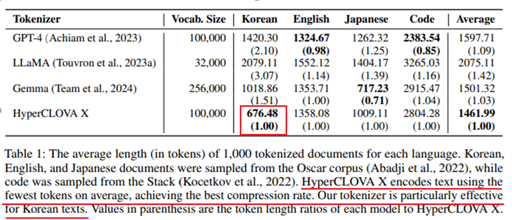 HyperCLOVA X Technical Report : https://arxiv.org/pdf/2404.01954 위 표를 토대로 하이퍼클로바 X에 포함된 토크나이저는 적은 토큰으로 효과적인 한국어 생성이 가능하다는 것을 확인할 수 있습니다. 이는 다른 말로, 적은 비용으로 효율적인 한국어를 만들어낸다고 볼 수 있는데요.