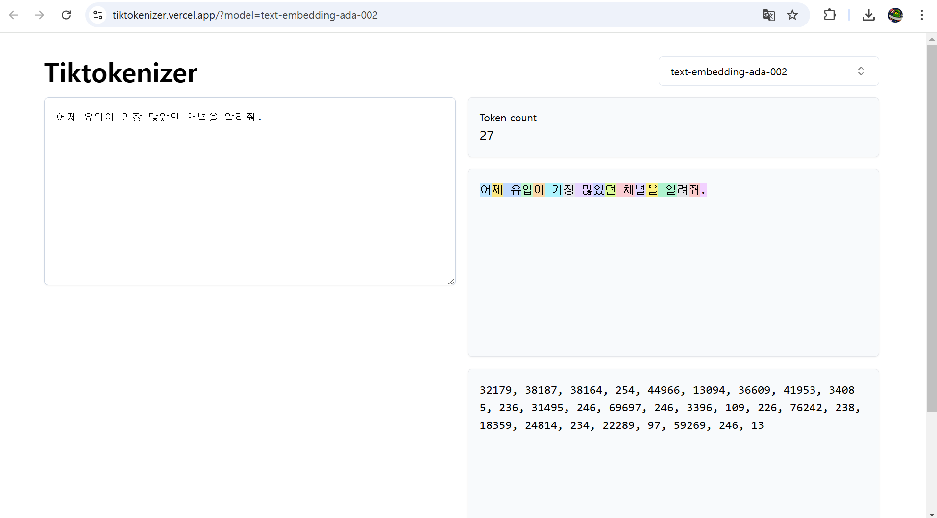 토큰계산기 웹사이트 : https://tiktokenizer.vercel.app/?model=text-embedding-ada-002 단, 토크나이저는 CLOVA Studio에서 제공되고 있는 Text-Embedding 모델들 중 임베딩 v2에서만 제공되고 있습니다. 임베딩 v2와 임베딩 v1은 가격 면에서 조금 차이가 있으며 임베딩 v2는 1 토큰당 0.0002원, 임베딩 v1은 1 토큰당 0.0001원으로 계산됩니다.