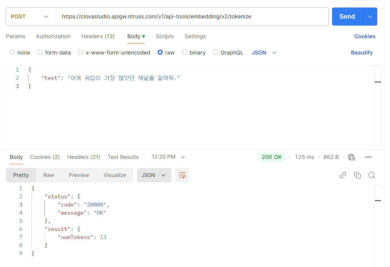 마찬가지로, CLOVA Studio에서 제공되고 있는 Text-Embedding 모델들도 한국어 특화 토크나이저를 사용하고 있기 때문에 비용면에서 이점을 취할 수 있을 것 같습니다. 실제로 CLOVA Studio 익스플로러에서 제공하고 있는 토큰 계산기(임베딩 v2) API를 활용해서 발생한 토큰 수를 계산해 보면 아래 문장에 대해 13 토큰으로 분리가 되었다는 사실을 알 수 있습니다.
