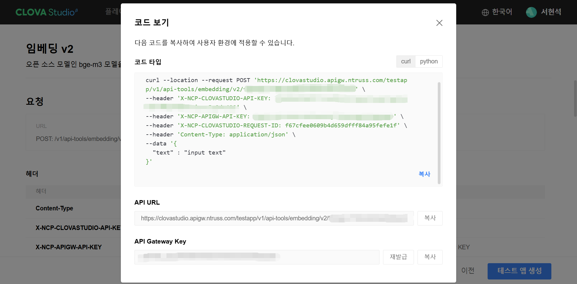 CLOVA Studio 익스플로러 임베딩 v2 테스트 앱 생성 테스트 앱을 생성하고 난 후에는 다음과 같이 필요한 정보들을 확인하실 수 있습니다.