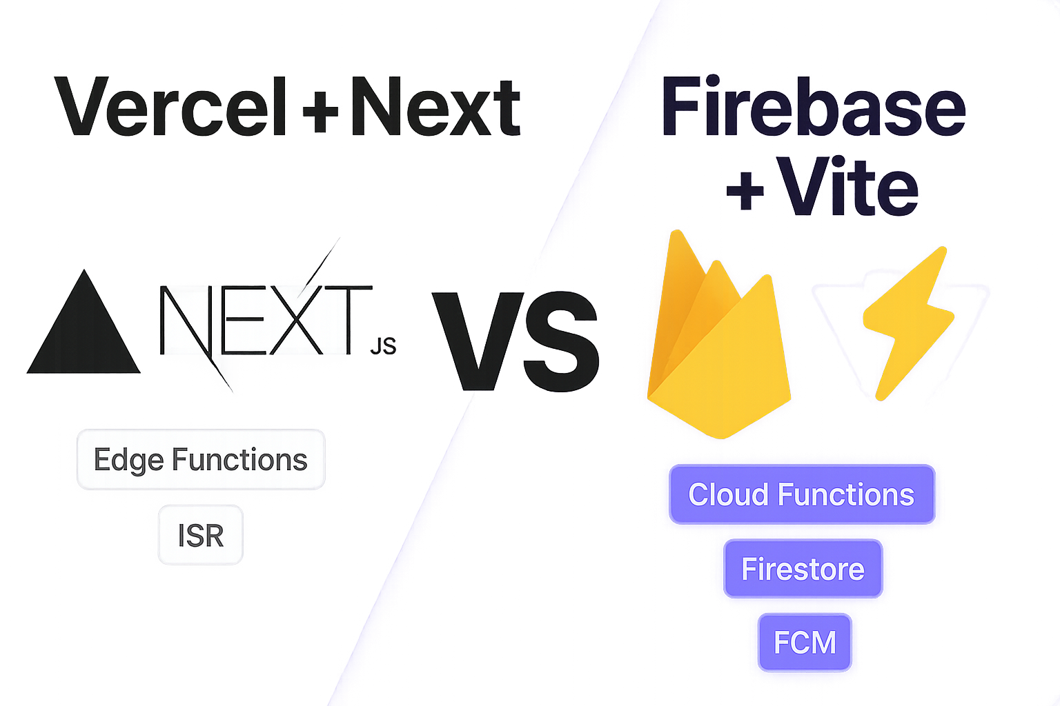 Vercel + Next vs Firebase + Vite Vercel과 Next 조합은 워낙 유명하고 사람들이 많이 쓰는 조합이기 때문에 저도 ChatGPT에게 물어보기 전에는 이 아키텍처로 가야겠다는 생각을 어느 정도하고 있었는데요. 그러나 ChatGPT가 건네준 제안들 중에 유독 제 관심을 끌었었던 조합은 Firebase 원벤더 기반의 아키텍처였습니다.