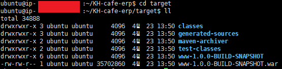 제 프로젝트 이름은 KH-cafe-erp 입니다. jar 파일 같은 경우에는 자바 명령어로 실행을 시킬 수 있습니다. (임베디드 톰캣에서 자동으로 구동됨)