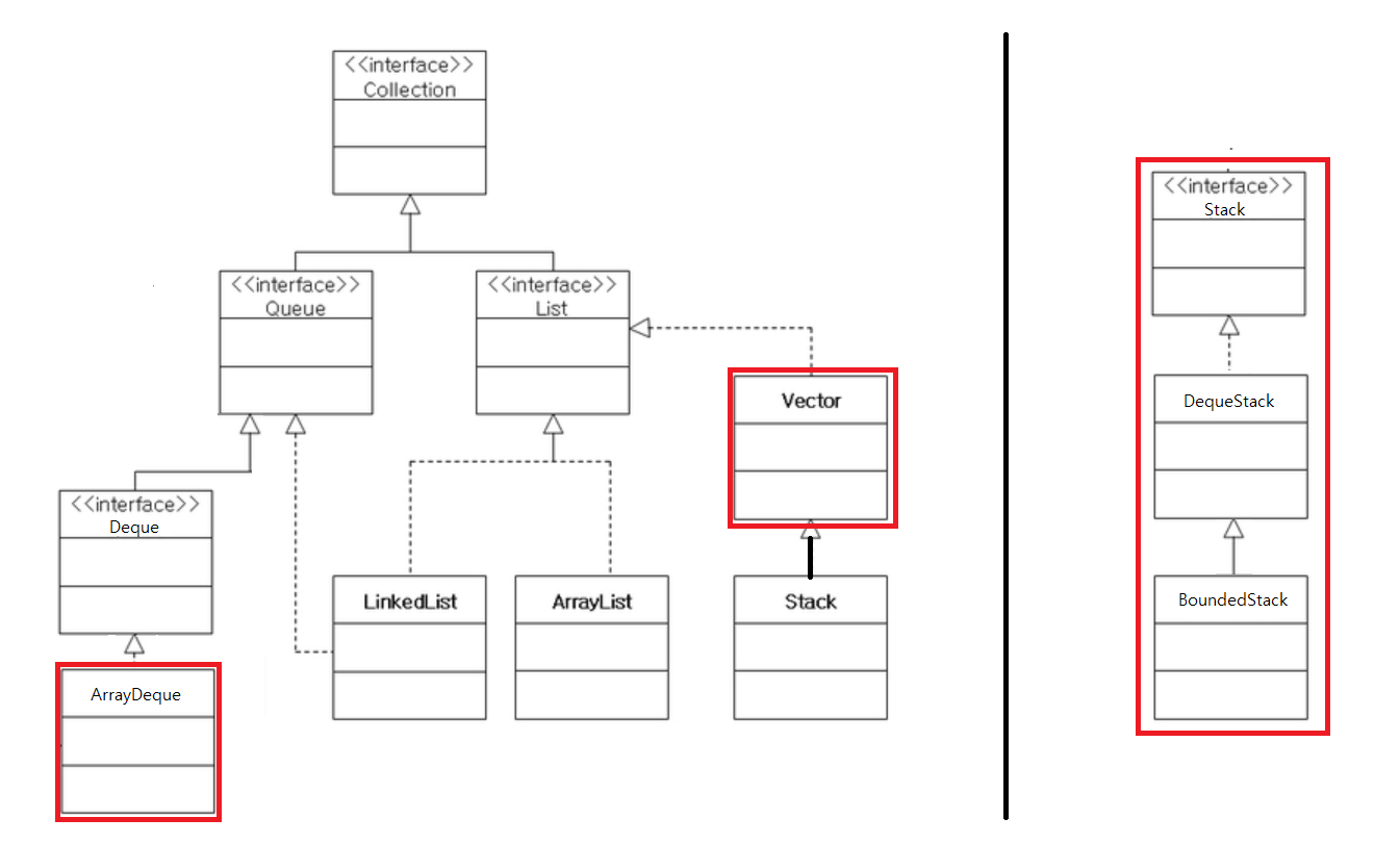 public class BoundedStack<T> extends DequeStack<T> { // ... @Override public void push(T object) { if (count < UPPER_BOUND) { count++; deque.addFirst(object); } } @Override public T pop() { count--; return deque.removeFirst(); } }따라서 다음과 같이 위에서 만든 DequeStack을 상속받아 한번더 오버 라이딩해주는 것이 더 안전하다 라고 할 수 있습니다. 이렇게 만든 경우 Vector클래스와 Deque클래스 둘 중 어느 것이라도 BoundedStack클래스와 is-a관계가 성립이 되지 않기 때문에 안전한 방법입니다.