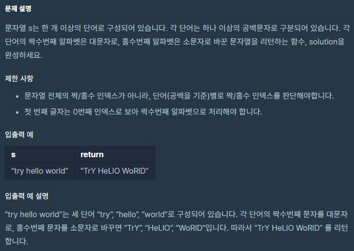import java.util.StringTokenizer; public class MakeStangeString { public static String solution(String s) { String answer = ""; StringTokenizer st = new StringTokenizer(s," ",true); String[] str = new String[st.countTokens()]; StringBuilder sb = new StringBuilder(); int i = 0; while(st.hasMoreTokens()) { str[i++] = st.nextToken(); } for(i=0; i<str.length; i++) { if(str[i].startsWith(" ")) sb.append(" "); else { for(int j=0; j<str[i].length(); j++) { if(j % 2 == 0 || j == 0) sb.append(Character.toUpperCase(str[i].charAt(j))); else if(j % 2 == 1) sb.append(Character.toLowerCase(str[i].charAt(j))); } } } answer = sb.toString(); return answer; } //테스트 문자열 public static void main(String[] args) { solution("try hello world"); solution(" s d"); } }StringTokenizer를 이용하여 문제를 푼 방법입니다.