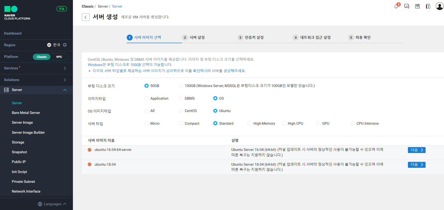 저는 vCPU 8코어에 메모리 8기가 이상의 사양을 가진 서버 중에 가격이 제일 싼 서버를 선택할 것이기 때문에 classic 환경을 선택하였고, OS 같은 경우에는 centOS는 7버전만 지원하기 때문에 Ubuntu로 설치하였습니다. (저의 경우에는 사용하려고 하는 라이브러리가 centOS 8부터 지원했습니다. 따라서 서버에서 사용하려는 모듈 및 라이브러리 먼저 확인 후 OS 이미지 타입을 선택하시는 것이 좋습니다.)
