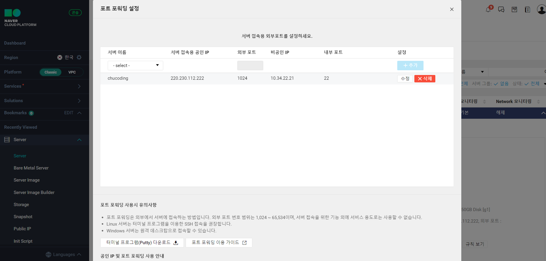 putty를 이용하여 원격 호스트에 접속하려면 먼저 포트 포워딩을 통해 외부 포트를 개방해 주어야 합니다. 화면에 [포트 포워딩 설정] 버튼을 클릭하여 1024번을 개방해줍니다.