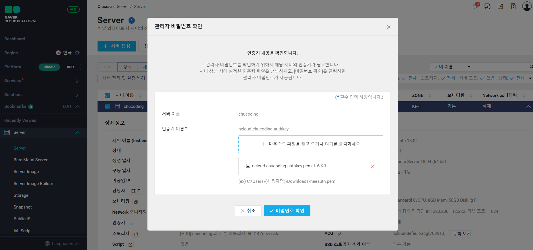 서버 생성할때 인증키 설정 과정이 있던 것을 보셨을 것입니다. 그 인증키로 저희는 root계정의 비밀번호를 확인할 것 입니다. 비밀번호 확인 방법은 Server 화면에서 왼쪽 상단의 [서버 관리 및 설정 변경] > [관리자 비밀번호 확인] 버튼을 차례로 눌러줍니다.