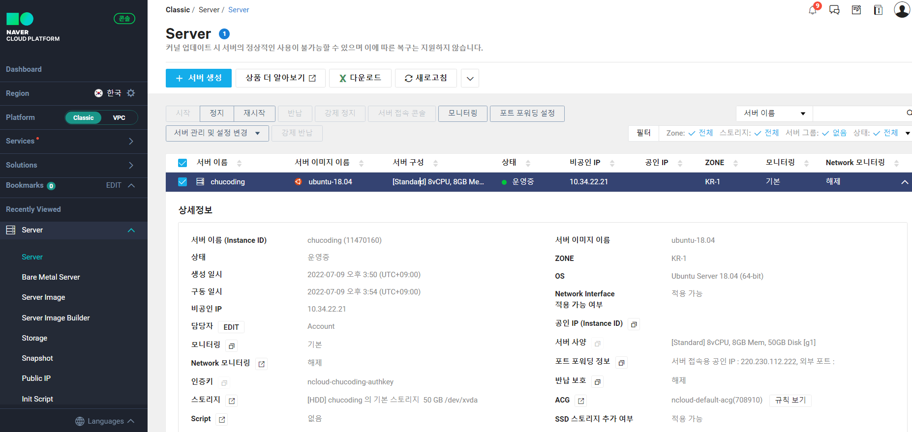 저는 위 포스팅 글에서 설치한대로 classic 환경에서 제공하는 1세대 Standard 타입의 서버를 이용해서 도커를 설치해보도록 하겠습니다.