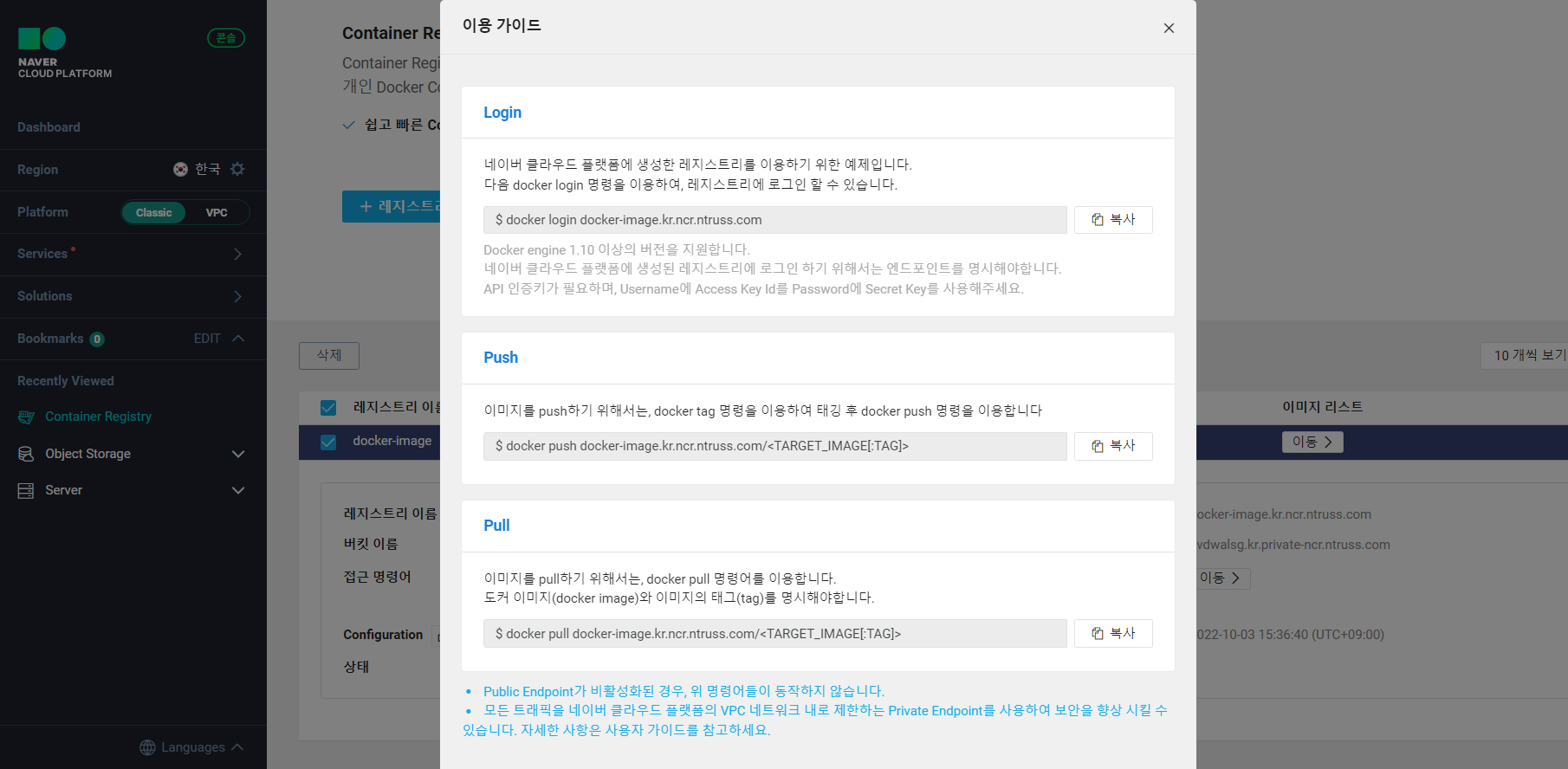 이용 가이드에서 제공해주는 명령어를 이용해 docker image를 push하고 pull할 수 있습니다.