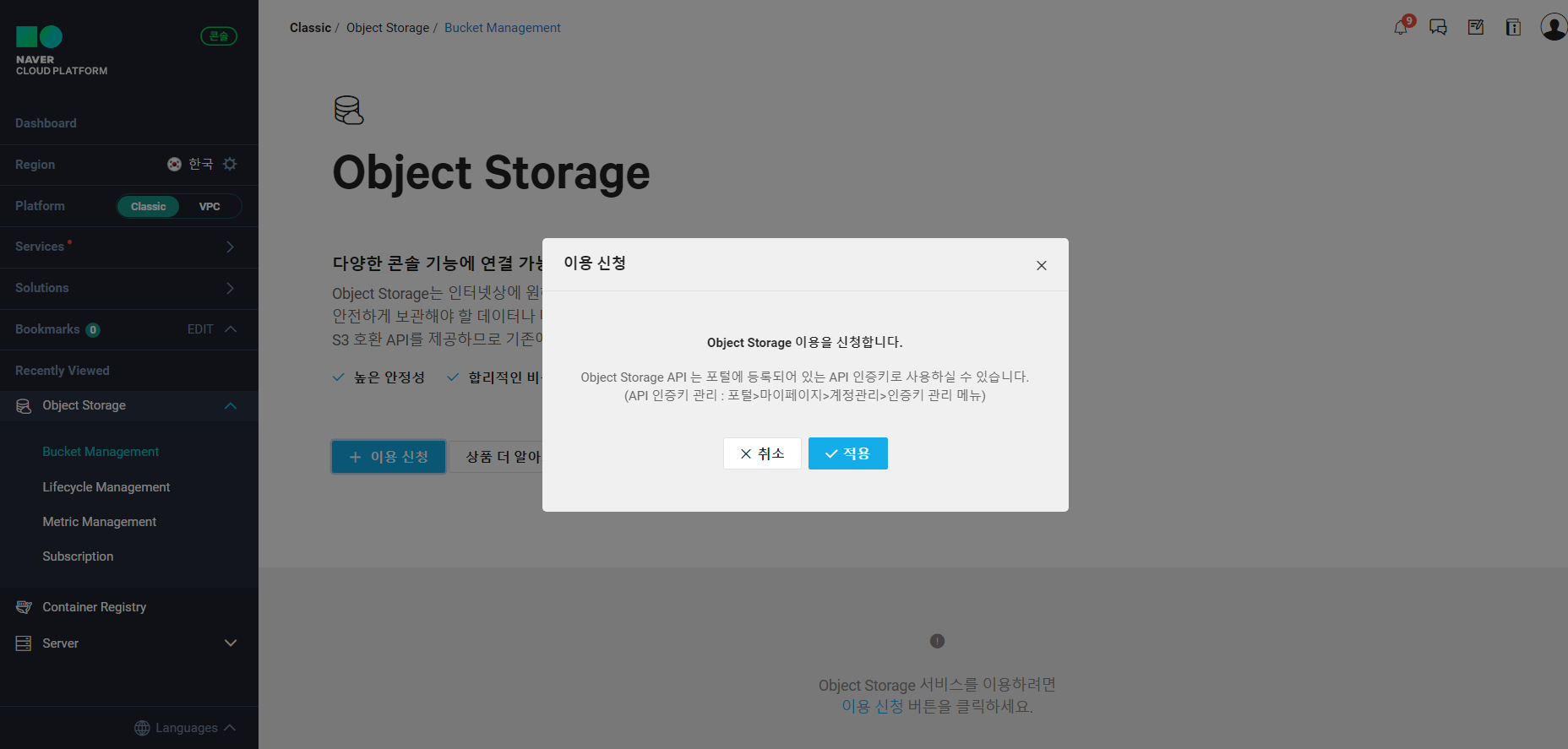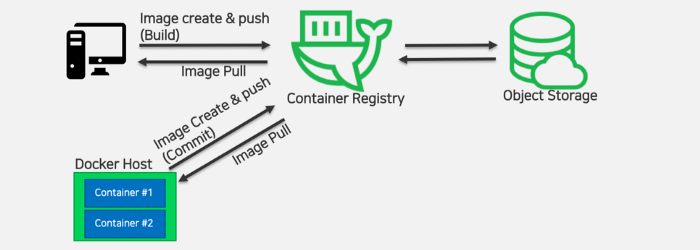 위의 그림과 같이 기본적으로 도커 컨테이너 이미지는 네이버 클라우드 플랫폼의 Object Storage라는 또 하나의 서비스를 이용하여 이미지를 저장합니다. 따라서 도커 컨테이너 레지스트리를 사용하기 위해서는 먼저 Object Storage 이용신청을 해야합니다.
