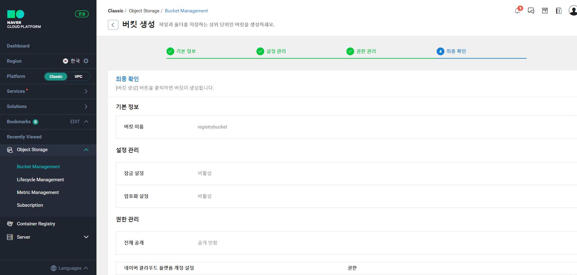 최종적으로 확인 후 하단에 [버킷 생성] 버튼을 클릭하면 [Bucket Management] 메뉴로 이동되며