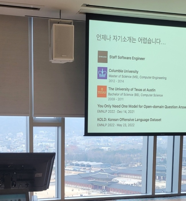 자리는 운이 좋은 건지 나쁜 건지 비교적 늦게 온 편에 속해 제일 앞자리에 앉게 되었습니다. 여담이지만 경복궁이 보이는 뷰가 예술이더군요. 세미나 자료 찍는척하면서 바깥 풍경을 한번 찍어보았습니다😖