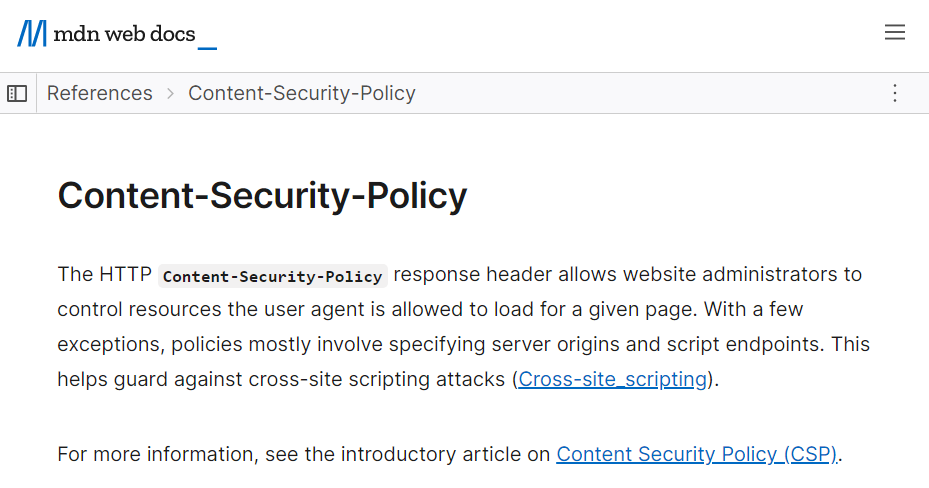 CSP는 웹 브라우저에서 사용하는 콘텐츠 기반의 보안 정책으로써 크로스 사이트 스크립팅 공격(XSS)을 보호하기 위한 정책이라고 나와있습니다.