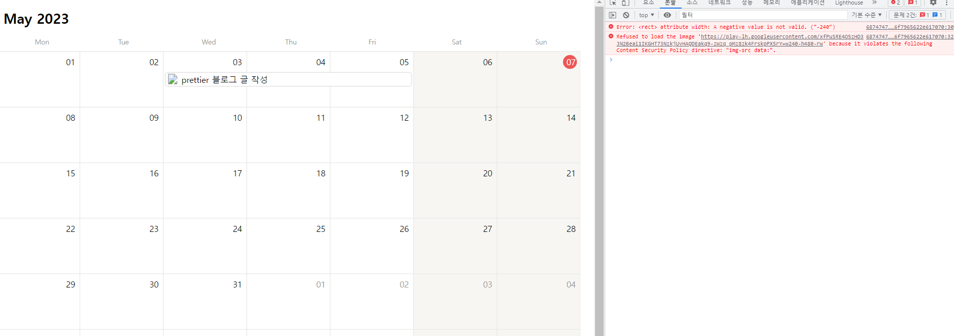 개발자도구를 열어서 확인해 보니 Content Security Policy(CSP)를 위반했다는 내용이 나옵니다.