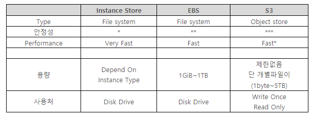 아마존 AWS EC2에서 제공하는 저장소(Storage)는 다음과 같이 총 4개 입니다.