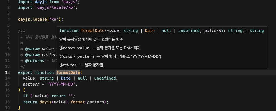 모든 언어가 마찬가지만 주석은 팀원, 그리고 코드를 읽는 사람들을 위해 작성하는 것이기 때문에 팀 간의 규칙을 만들어서 적용하는 것도 중요하지만 에디터(IDE)에서 지원이 되는 주석 포맷인지도 중요하다고 생각합니다. 이 부분이 결국 개발자들의 경험(DX)에 영향을 미칠 수 있기 때문에 대부분은 가장 일반적인 주석 컨벤션을 채택하여 사용합니다.