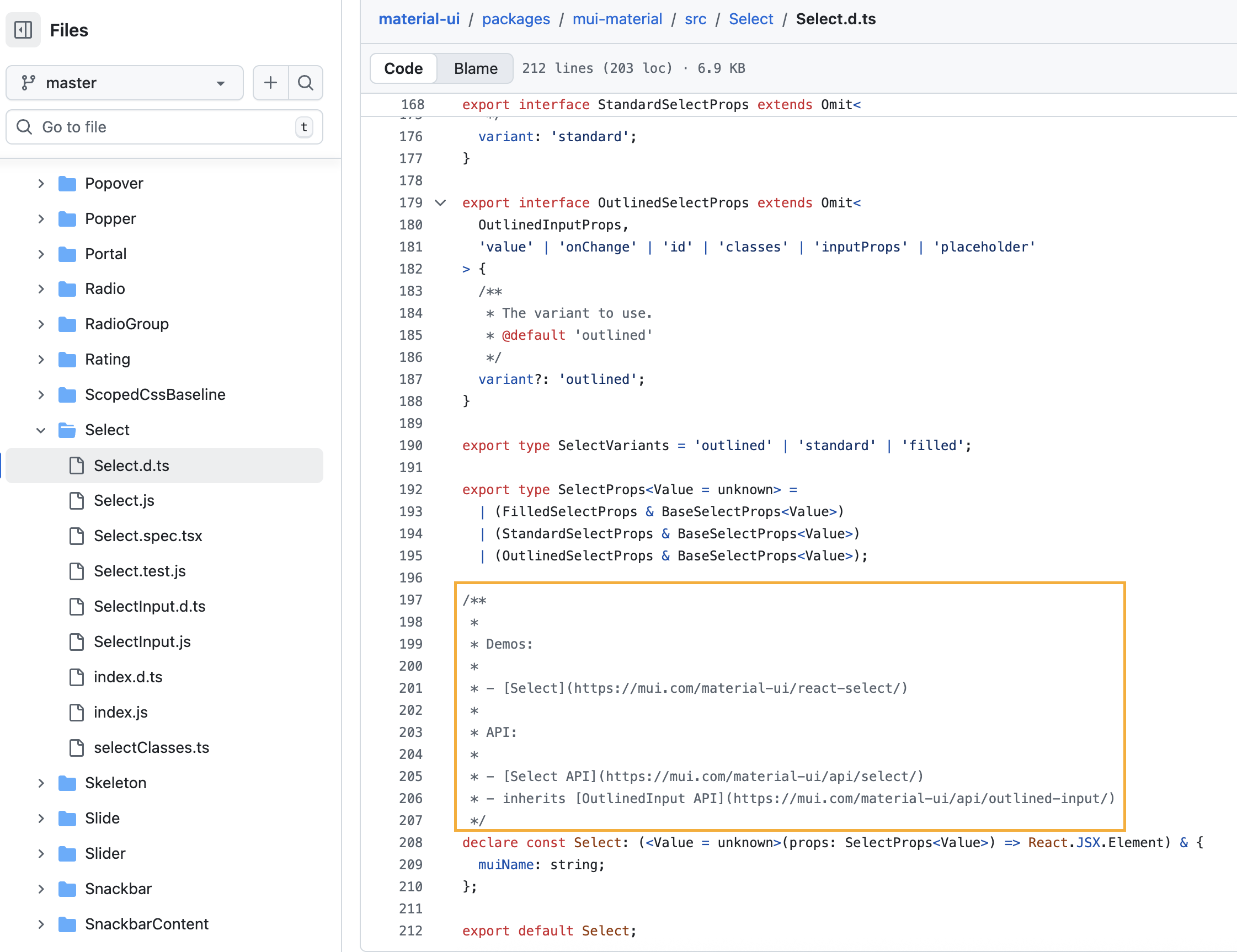 왜냐하면 AI가 알고 있는 JSDoc에는 React 컴포넌트에 대해 주석 다는 방법에 대한 정의가 없기 때문이죠. 이 때문에 사람들은 프로젝트마다 또는 팀마다 각자만의 방법들과 포맷들을 사용하기 때문에 AI가 일관되지 않는 주석을 사용하면서 우리들에게 일부 혼란을 줄 수 있습니다. 예를 들어, 유명한 오픈소스 CSS 프레임워크 중 하나인 Material UI는 컴포넌트에 다음과 같은 포맷을 주석으로 사용합니다.