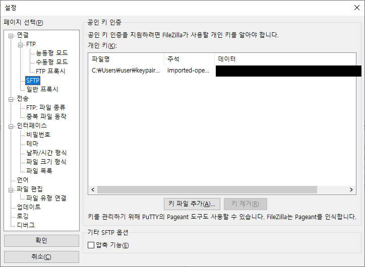 - [편집] > [설정] > [연결] > [SFTP]