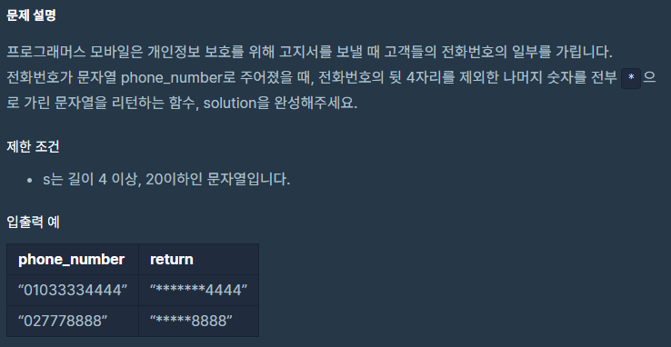 다른 풀이 보기 : [알고리즘/프로그래머스] - 코딩 테스트 연습 / 연습문제 / 핸드폰 번호 가리기 / JAVA