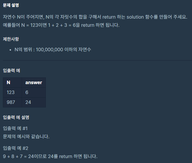 코딩테스트 연습 / 연습문제 / 자릿수 더하기